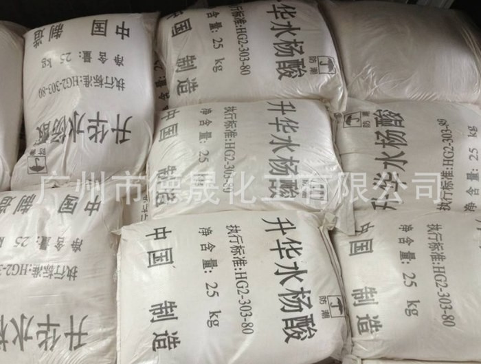 本品為白色塊狀和粉末,允許微黃或淡粉紅色,無(wú)臭味微甜后轉(zhuǎn)辛,置空氣中無(wú)變化,76℃以上能常壓升華。常壓加熱易脫羧而成苯酚及二氧化碳;其水溶液呈酸性反應(yīng),遇FeCl3呈紫色。本品在水中微溶、在沸水中溶解、在乙醇或乙醚中易溶,在氯仿中略溶。